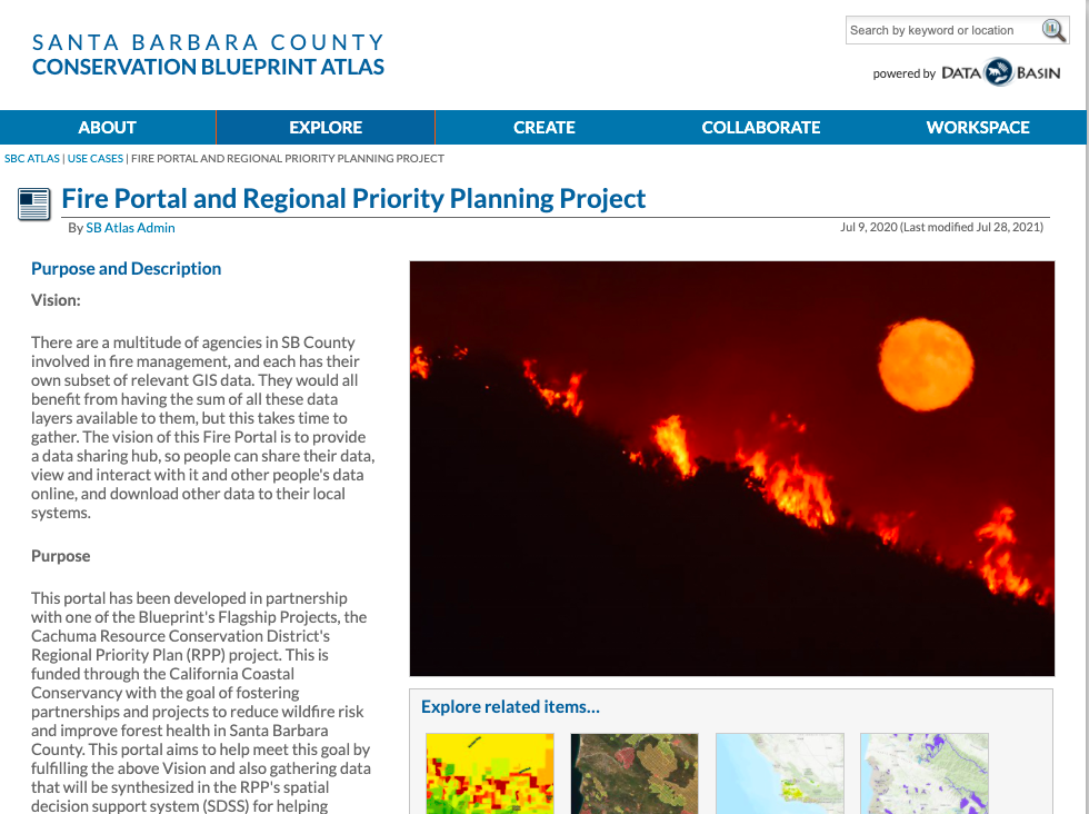 There are a multitude of agencies in SB County involved in fire management, and each has their own subset of relevant GIS data. They would all benefit from having the sum of all these data layers available to them, but this takes time to gather. The vision of the RPP Wildfire Portal the RPP team created is to provide a data sharing hub, so people can share their data, view and interact with it and other people's data online, and download other data to their local systems. As of July 2021, the team had collected the largest centralized Fire Database of GIS layers in the County, with over 150 GIS datasets. As time goes by, new GIS datasets pertinent to the project goals become available, as do updated versions of previous datasets. We recommend maintaining and adding to the repository overtime to ensure it remains relevant and up to date.